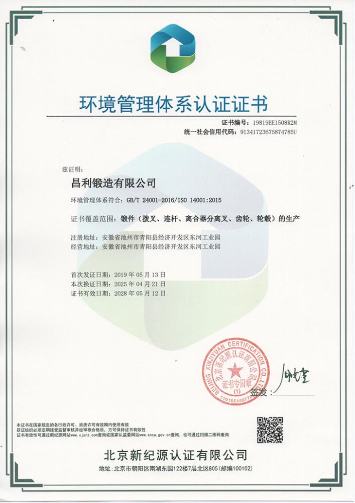 環(huán)境管理體系認證證書(中)
