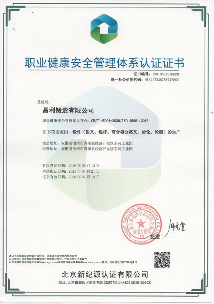 職業(yè)健康安全管理體系認證證書(中)